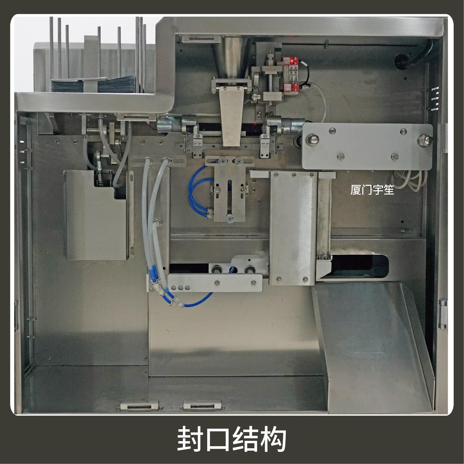 2、調(diào)試方便、占用空間小。包裝流程全自動(dòng),無需人工操作。可根據(jù)充填物料的性質(zhì)選配不同的下料結(jié)構(gòu)。