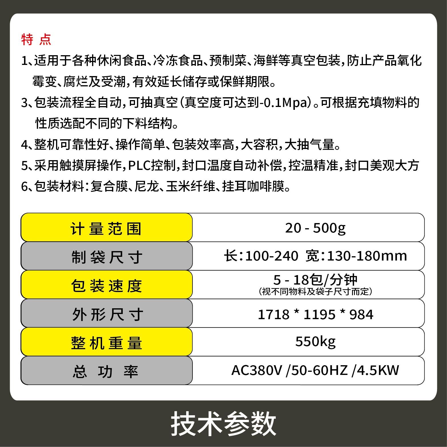 2、包裝流程全自動,可抽真空(真空度可達到-0.1Mpa)??筛鶕?jù)充填物料的性質選配不同的下料結構。