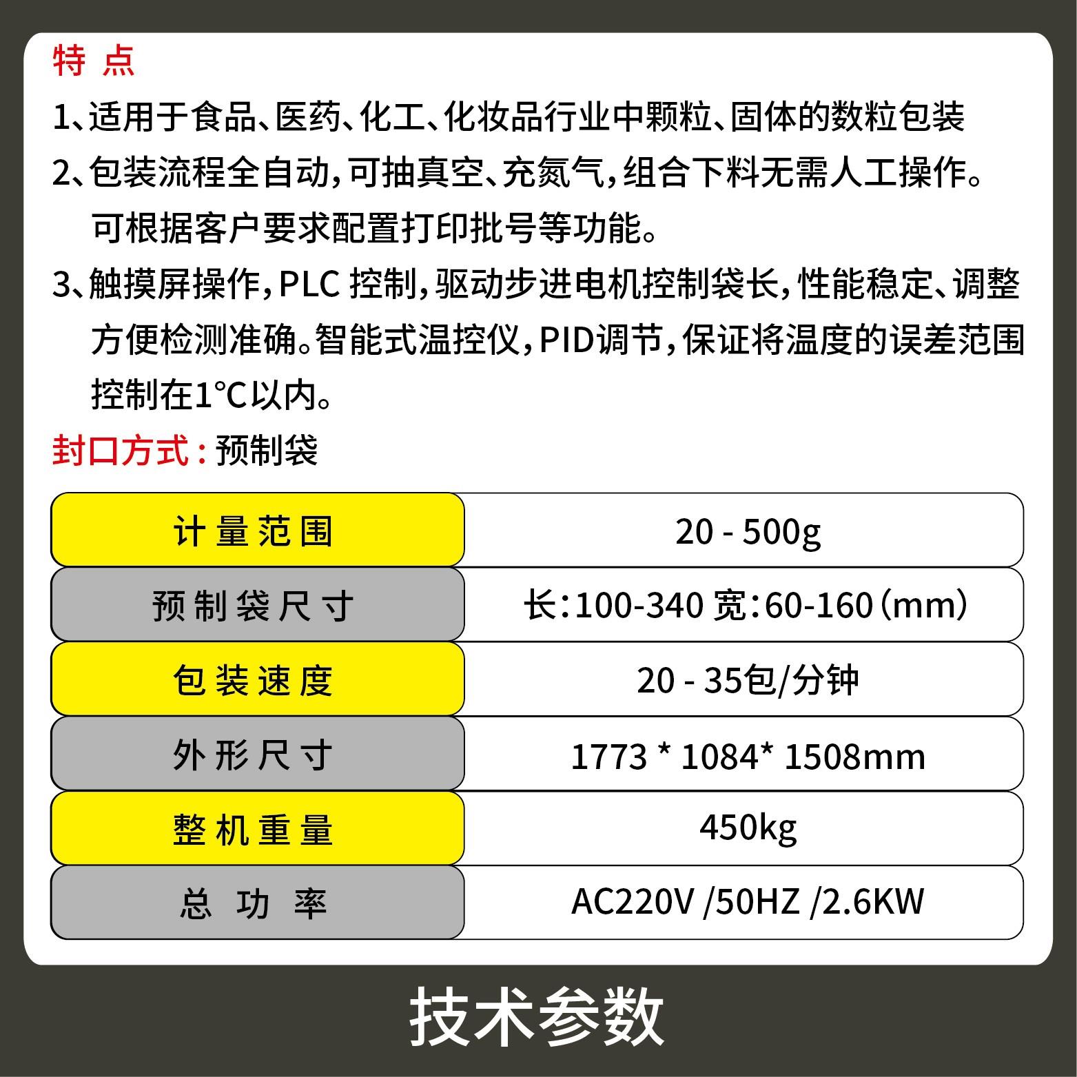 1、適用于寵物食品(貓糧、狗糧、貓砂等)、休閑食品(堅(jiān)果、鍋巴等)、咖啡豆、茶葉等物品的M袋計(jì)量包裝。